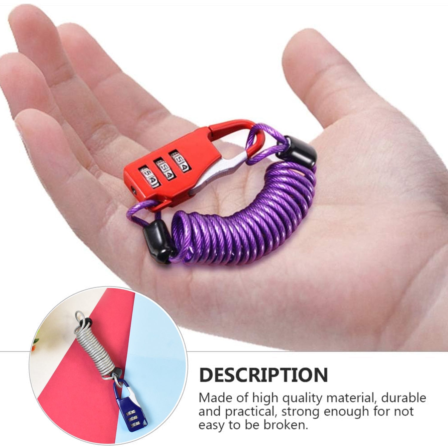 - High-quality materials: the helmet lock consists of a zinc alloy lock core, a PVC coating and a steel wire rope. The lock is cut, crack and jack-resistant and the durable PVC coating not only protects your motorcycle helmet from scratches, but also provides effective theft protection.