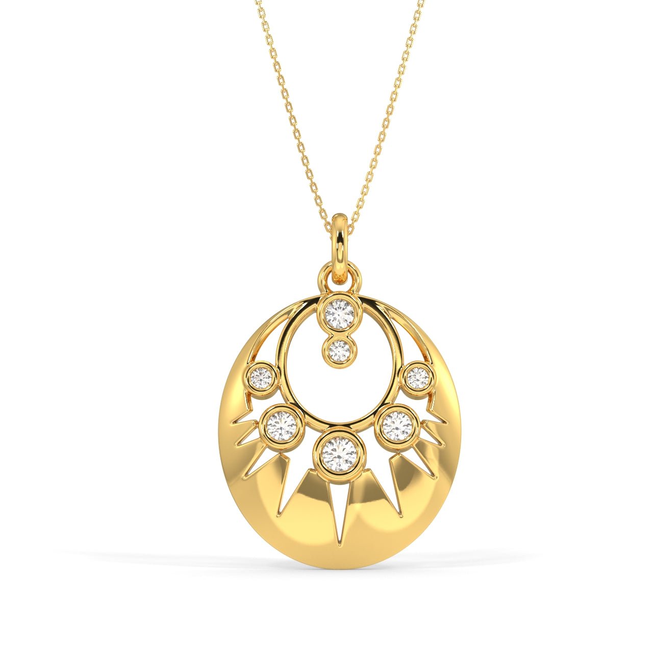 The "Harmony Necklace" is a whimsical piece adorned with seven sparkling diamonds, set in a cutsy design. Its pendant features an elegant oval circular shape, exuding a romantic allure. This necklace is a perfect accessory for a special date night, adding a touch of elegance and charm to any outfit.