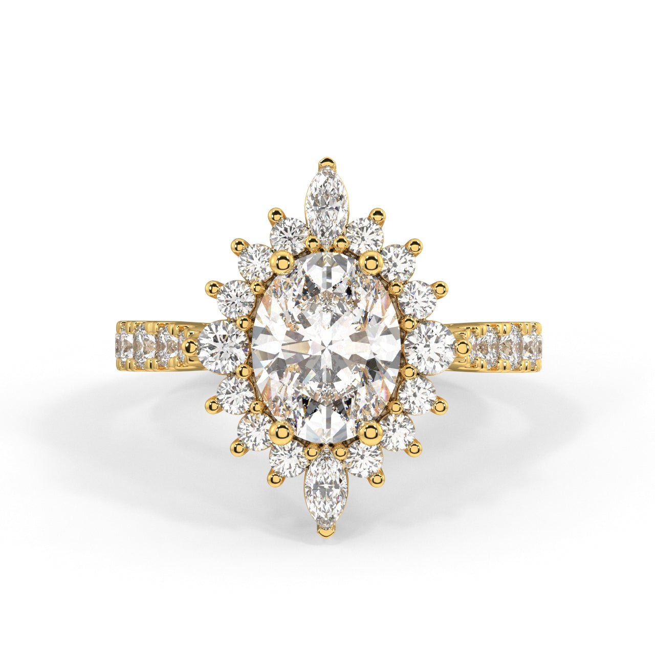 "Sunlight" ring captures the essence of a radiant sunrise with an oval diamond as its focal point, encircled by delicate rounds and marquise stones resembling sun rays. Symbolizing the abundance and warmth of the sun, this exquisite piece is made for those who embody sunshine, spreading light and joy wherever they go. With its intricate design and dazzling gemstones, the ring serves as a reminder of the brightness and positivity that its wearer brings to the world, a beacon of hope and happiness.